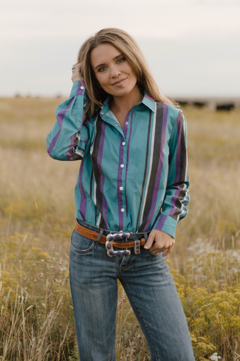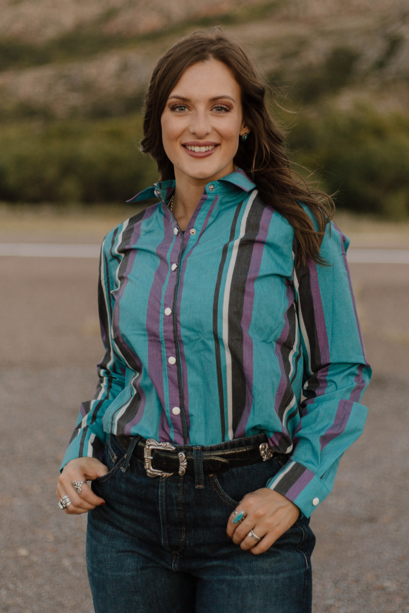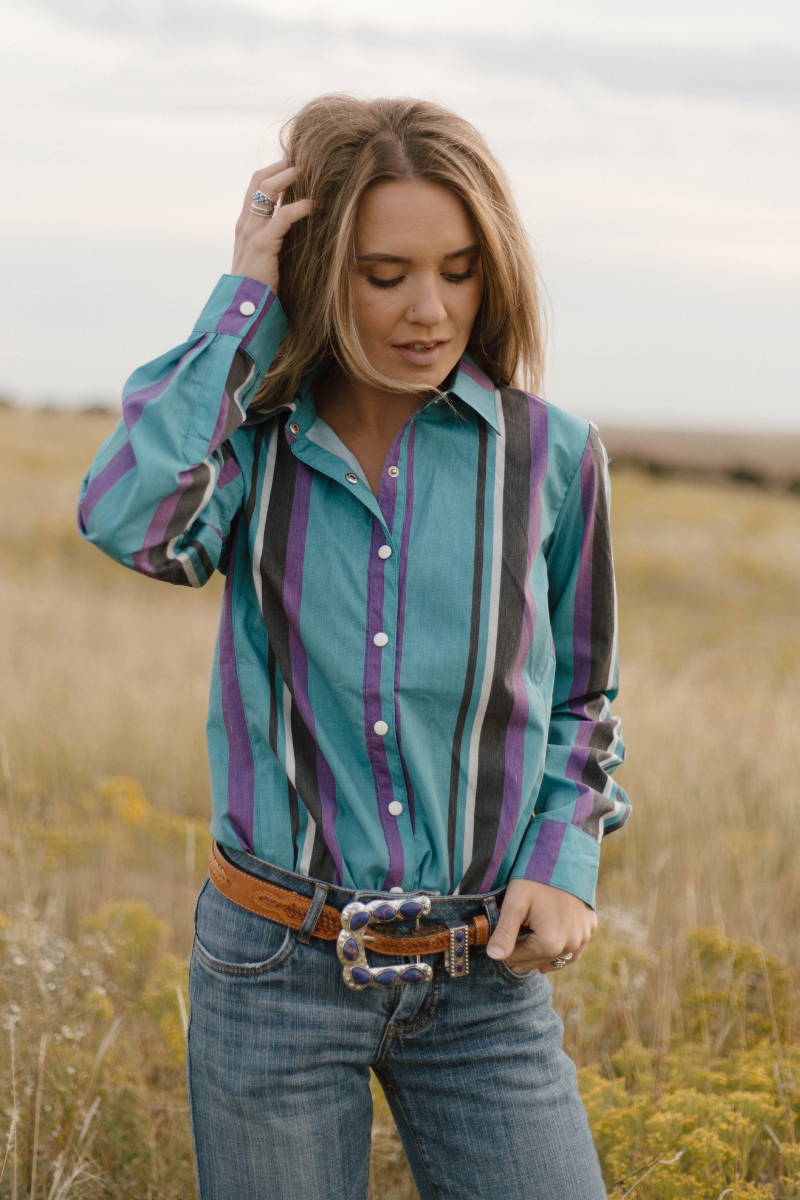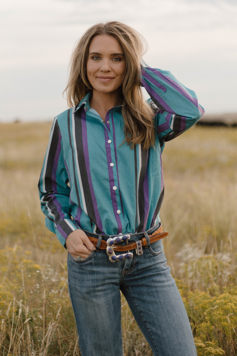 The Gotta Be Me Button Up features vibrant purple, blue, and black stripes, creating a bold and stylish look. Crafted with snap buttons for easy wear and a secure fit, this shirt brings effortless confidence to your everyday wardrobe. Perfect for making a statement, it combines distinctive color with practical design to keep you comfortable and confident all day.