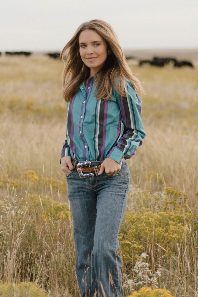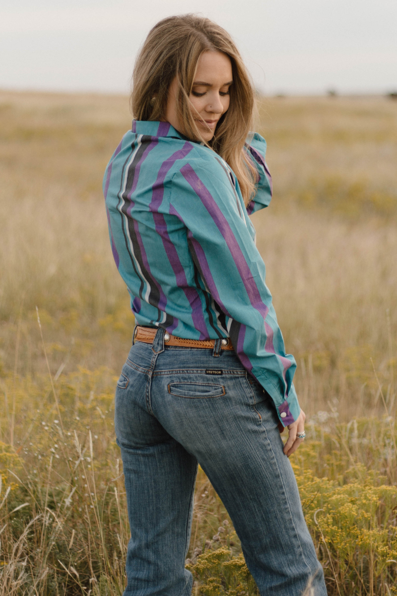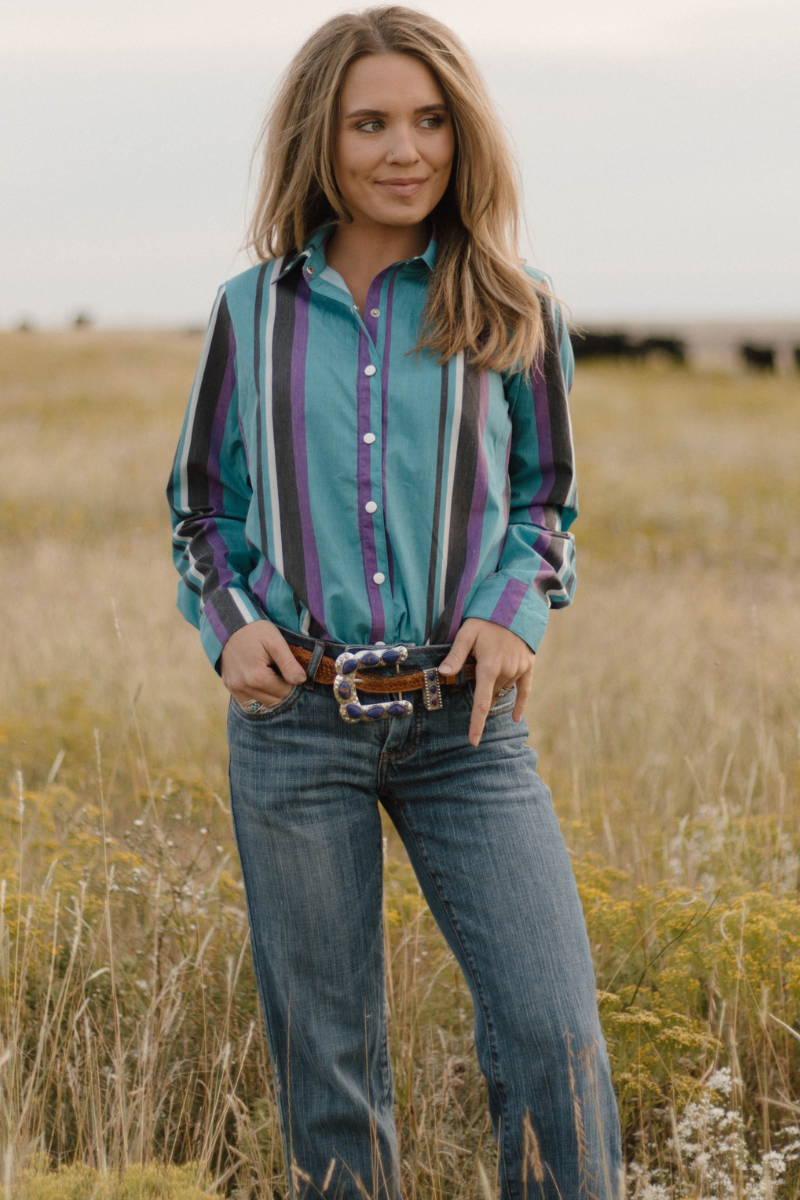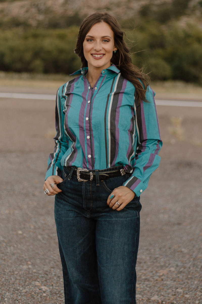 The Gotta Be Me Button Up features vibrant purple, blue, and black stripes, creating a bold and stylish look. Crafted with snap buttons for easy wear and a secure fit, this shirt brings effortless confidence to your everyday wardrobe. Perfect for making a statement, it combines distinctive color with practical design to keep you comfortable and confident all day.