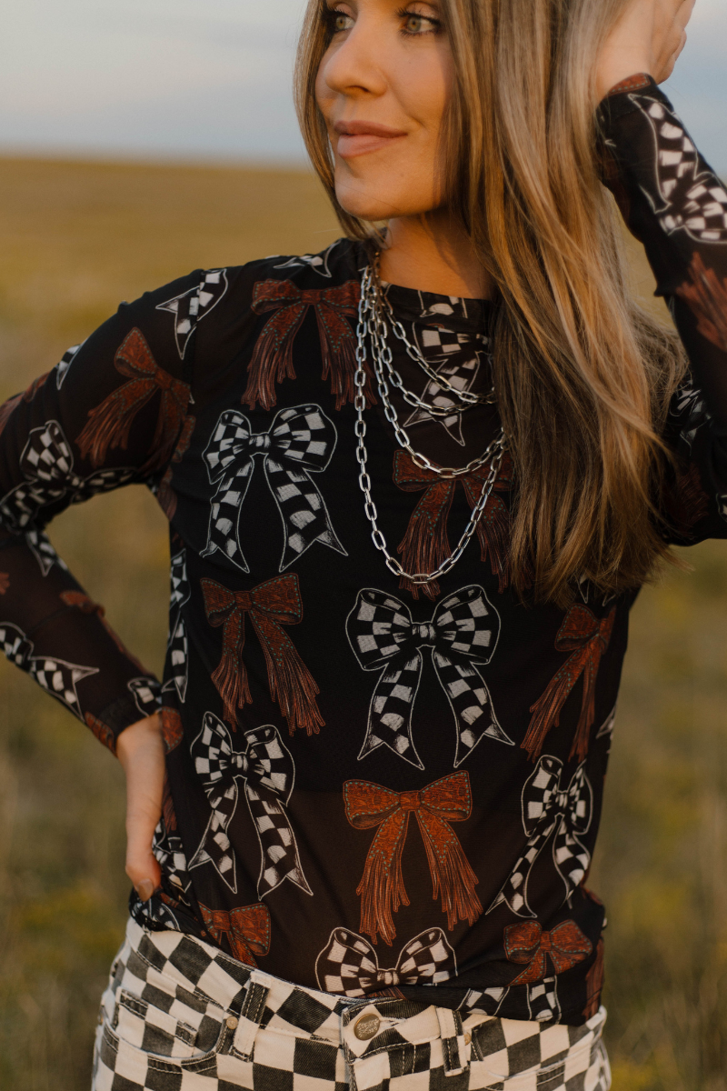 Get ready to feel absolutely adorable in our Just A Girl Mesh Top! Made with cute, comfy and stretchy fabric, this top features charming checkered and tooled bows, making it the perfect addition to any outfit. Embrace your inner cuteness with this must-have top!
