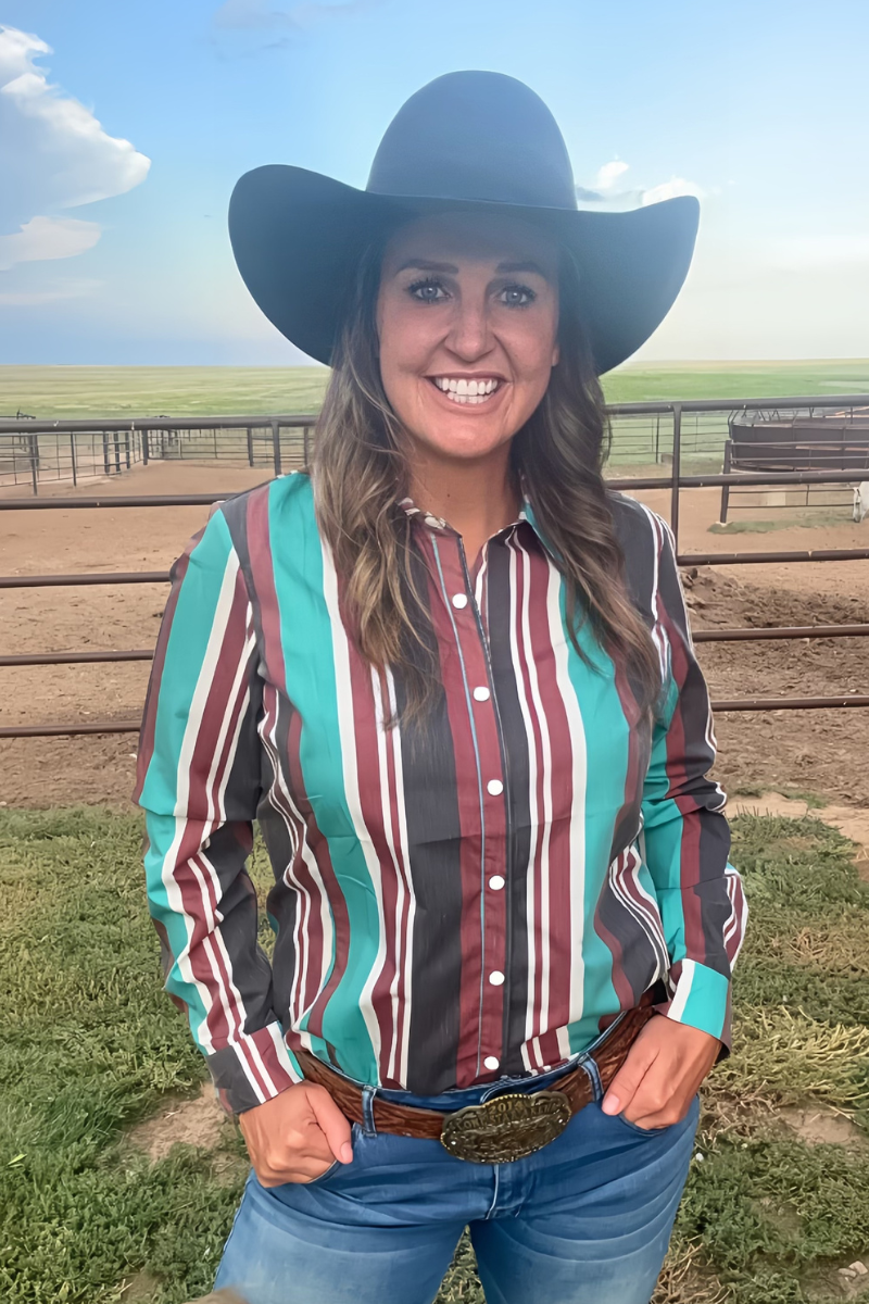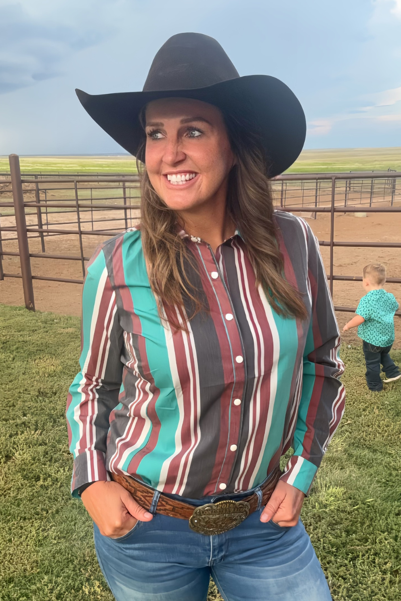 Add a splash of vintage flair to your look with the Oh My Darling Button Up. Featuring classic rodeo pearl snaps and bold red, black, and turquoise stripes, this shirt brings playful charm and timeless style together. Perfect for standing out whether you’re out on the town or just feeling a little wild.