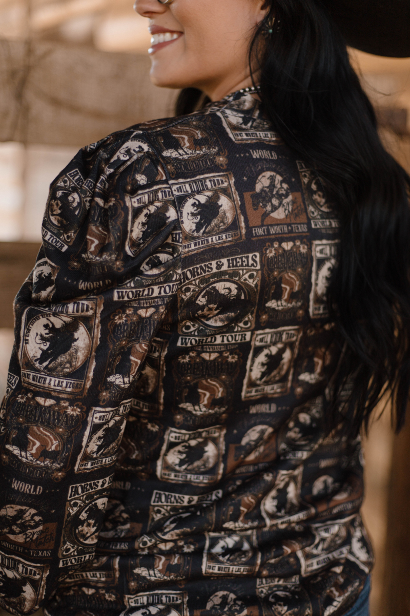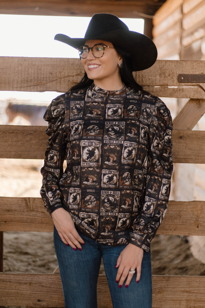 Embrace timeless western charm with the Prairie Playbill Top. This long sleeve bubble top features vintage rodeo poster prints that bring a nostalgic, bold statement to your wardrobe. Its relaxed silhouette offers comfort and style, perfect for those who want to showcase their love for classic rodeo culture with a modern twist. Whether paired with jeans or skirts, it’s your go-to piece to stand out effortlessly.