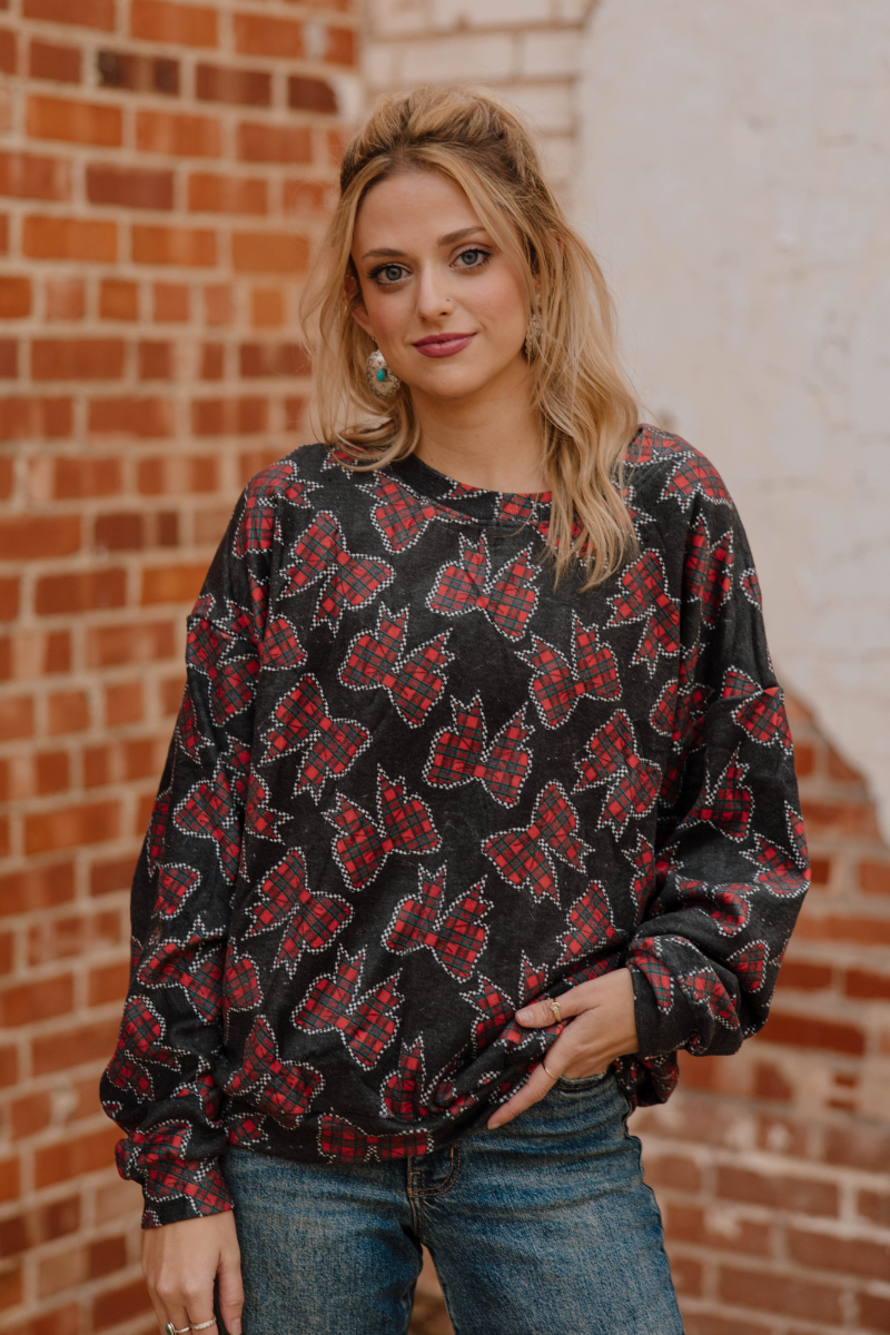 Elevate your style with the Rancher's Ribbon Top, featuring charming plaid bows outlined in striking black and white checks that add a unique twist to classic design. The sleek black background enhances the bold contrast, making this top a standout piece perfect for any casual or dressy occasion. Its eye-catching details bring both sophistication and playful flair to your wardrobe.
