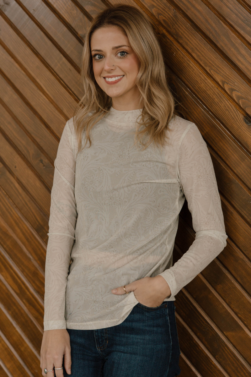Say hello to your new go-to top—this cream-on-cream tooled mesh number is basically the fashion equivalent of a best friend. The intricate tooled design gives it personality while the mesh keeps things breezy and breathable. Layer it, wear it solo, dress it up or down—this top is endlessly adaptable and always ready for whatever you throw at it. Simple, stylish, and seriously versatile.