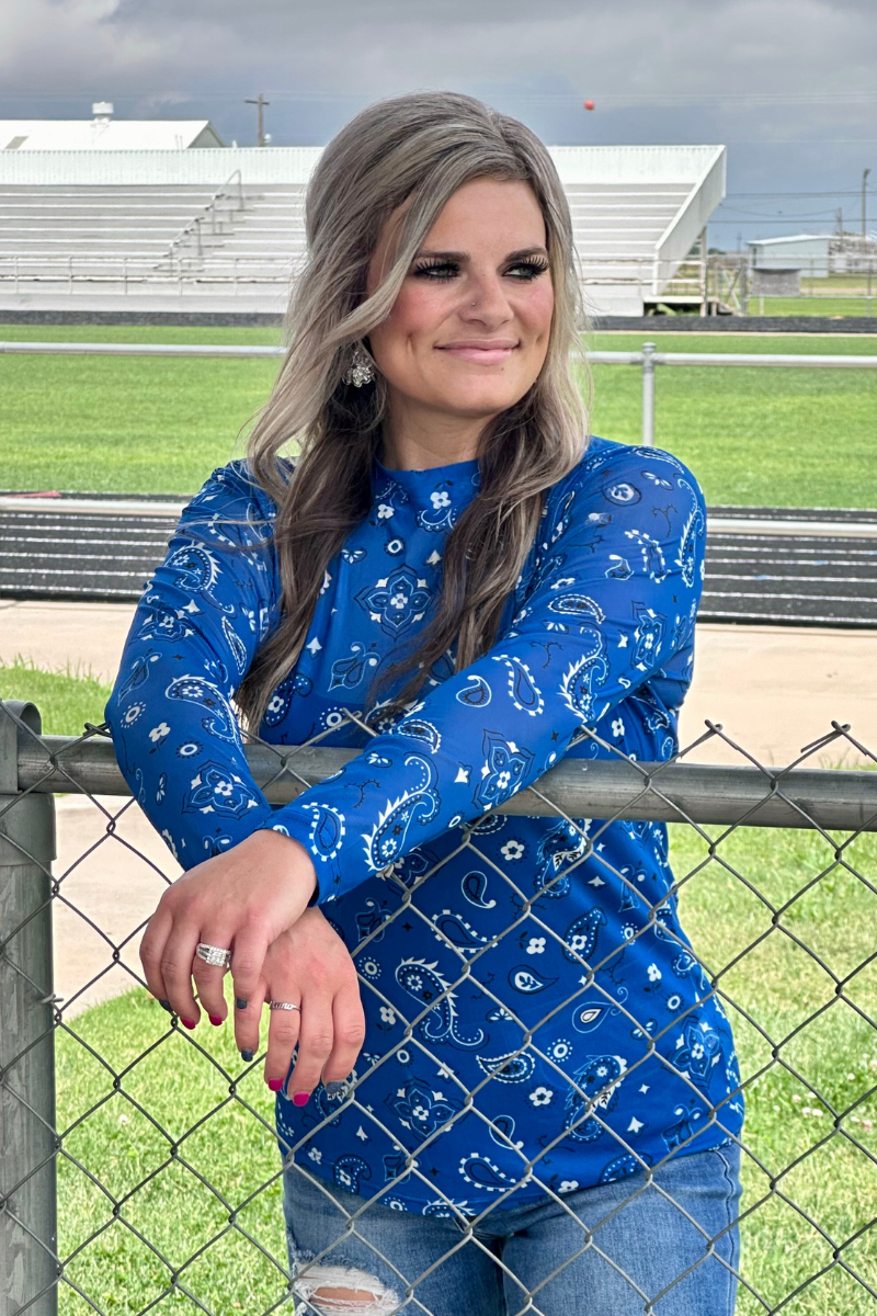 Get ready to rock some major boho vibes with our Bandana Babe Mesh Top in Blue! This cute top features a playful bandana print made to stand out. The stretchy fabric and mesh top provide a comfortable fit and cool look, making it perfect for any adventure or festival. Get yours now!