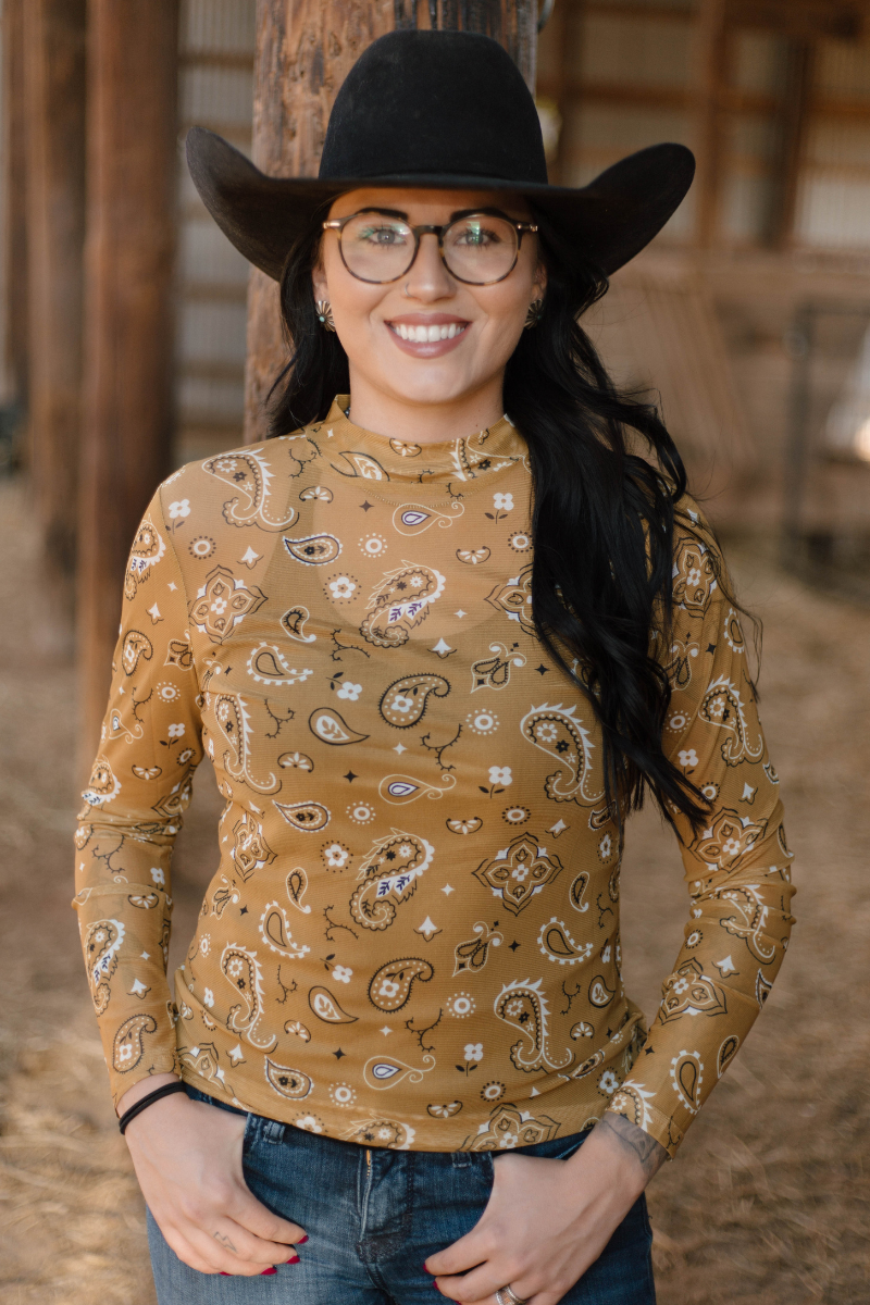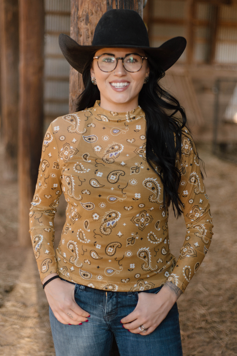 Add a pop of playful charm to your wardrobe with the Bandana Babe Mustard Mesh. This vibrant mustard-colored mesh fabric features a fun bandana print, perfect for layering or making a bold statement on its own. Lightweight and breathable, it’s designed to keep you comfortable while turning heads wherever you go. Embrace your inner trendsetter with this lively, eye-catching piece!