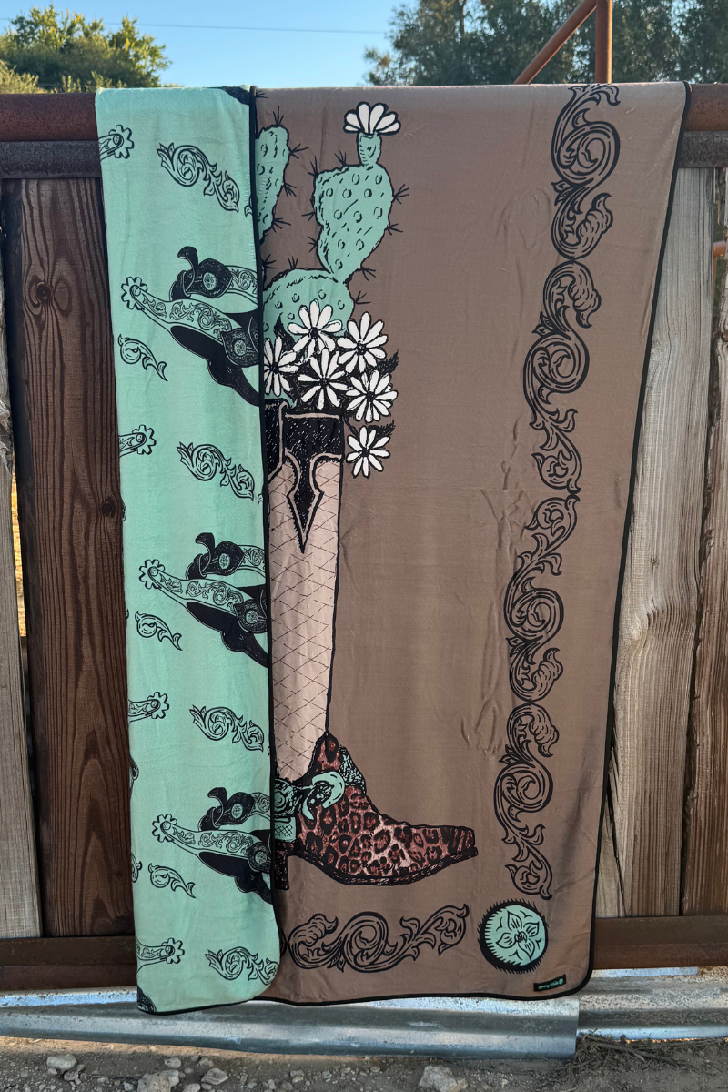 Wrap yourself in rustic charm with the Boots and Burlap Blanket. Featuring a detailed cactus and boot design on one side and a classic spur pattern on the other, this cozy blanket brings a touch of Western character to any space. Perfect for chilly evenings or as a stylish accent, it combines comfort with a bold, authentic look that celebrates rugged outdoor spirit. Make this unique blanket a warm, inviting addition to your home or a thoughtful gift for lovers of Western style.