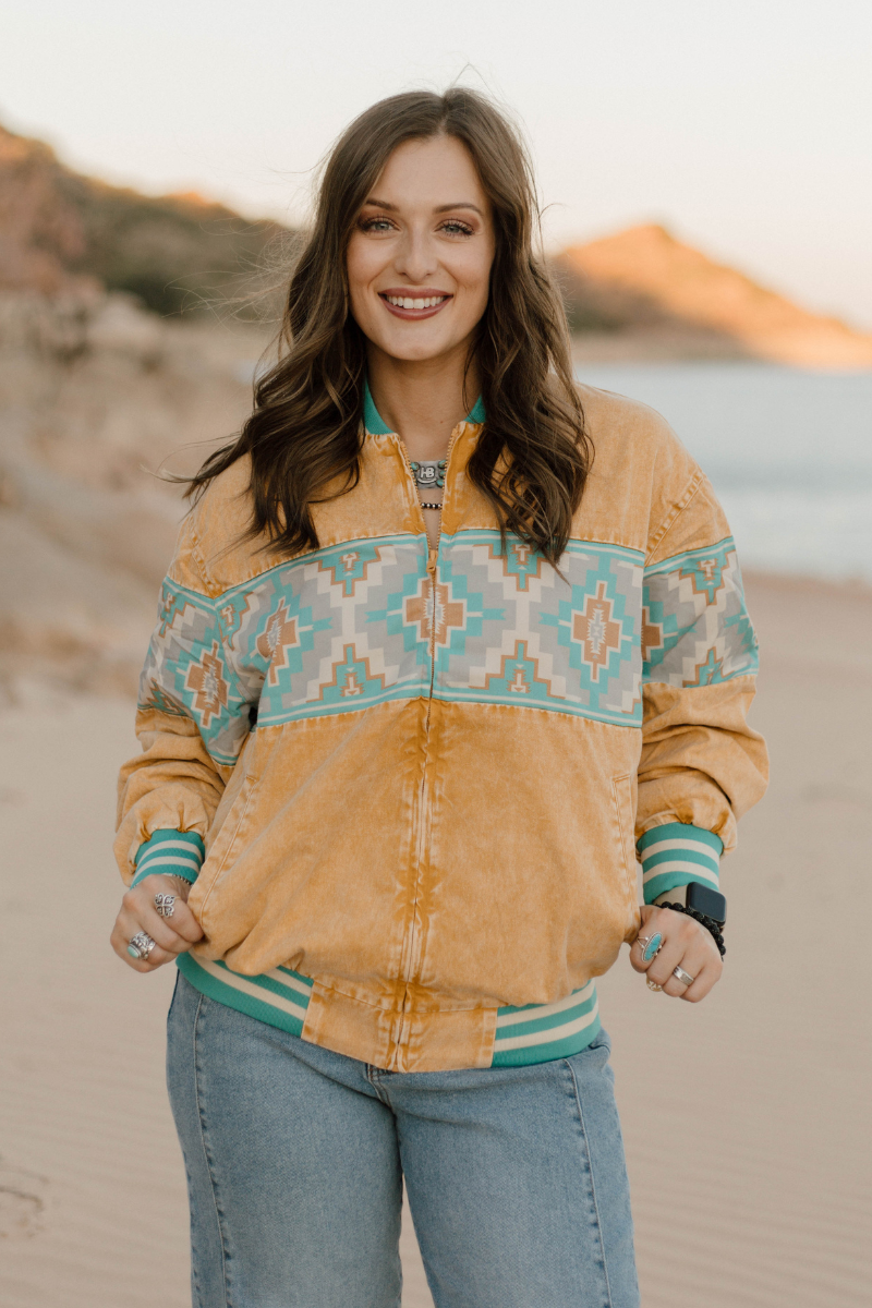 Step back into the 90’s with this fresh mustard bomber jacket that brings just the right burst of turquoise to brighten your look. Its bold color combo adds a playful twist to any outfit, making it a standout piece for your casual adventures or retro-inspired days. Perfect for those who love a little nostalgia mixed with vibrant style.