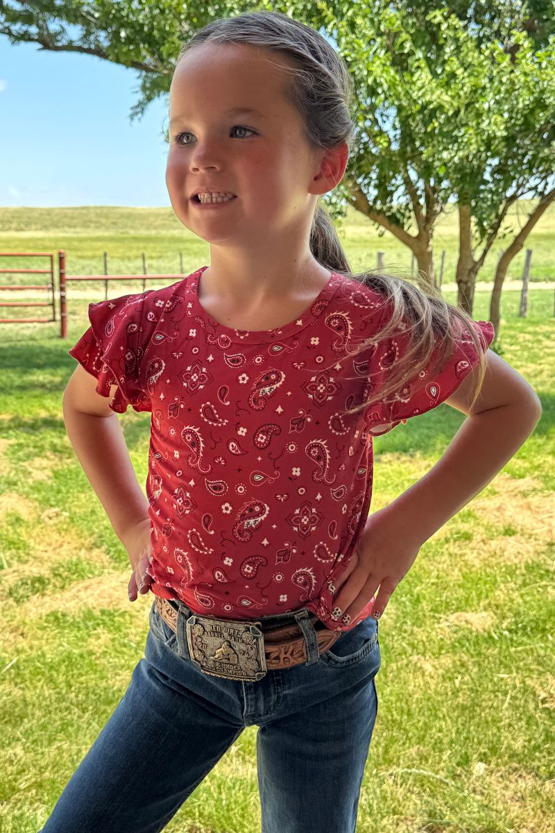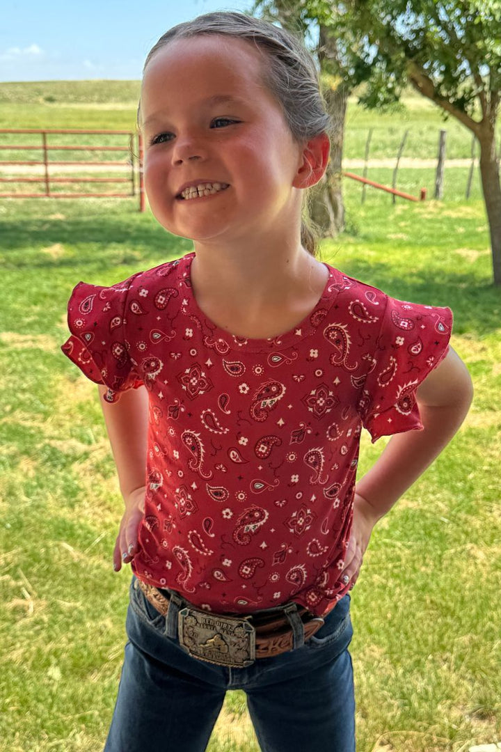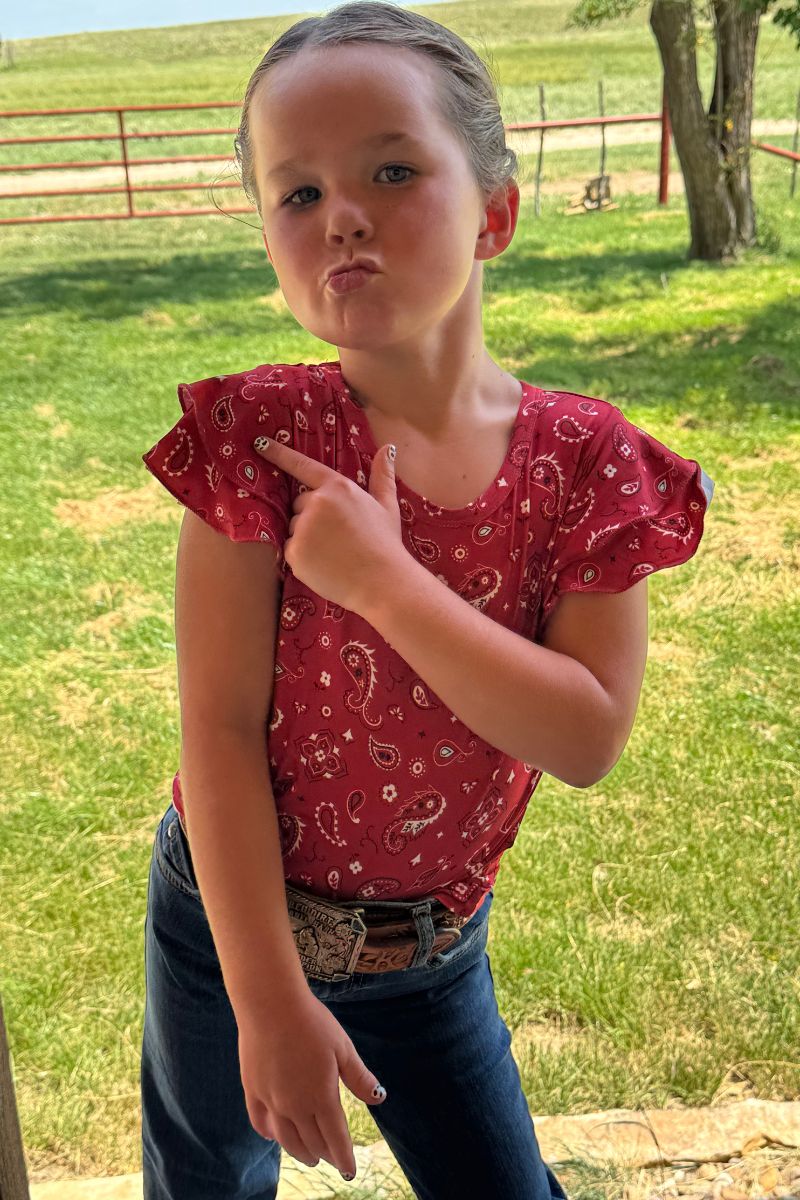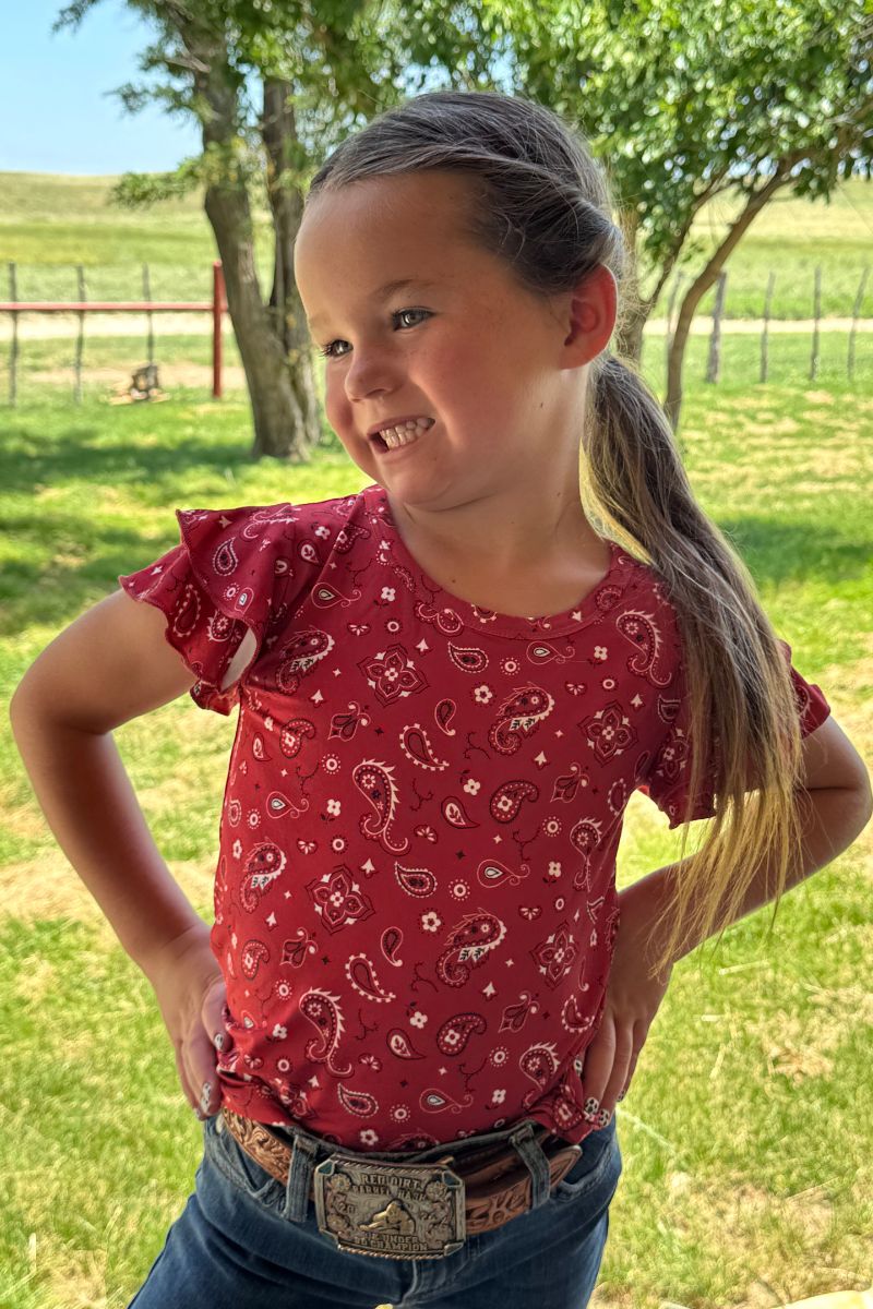 The Bandana Babe Kids Top features adorable ruffled sleeves and a vibrant red bandana print that adds a playful touch to any outfit. Made from buttersoft, stretchy fabric, it ensures all-day comfort and easy movement for your little one. Perfect for fun-filled days, this top combines style and softness effortlessly.