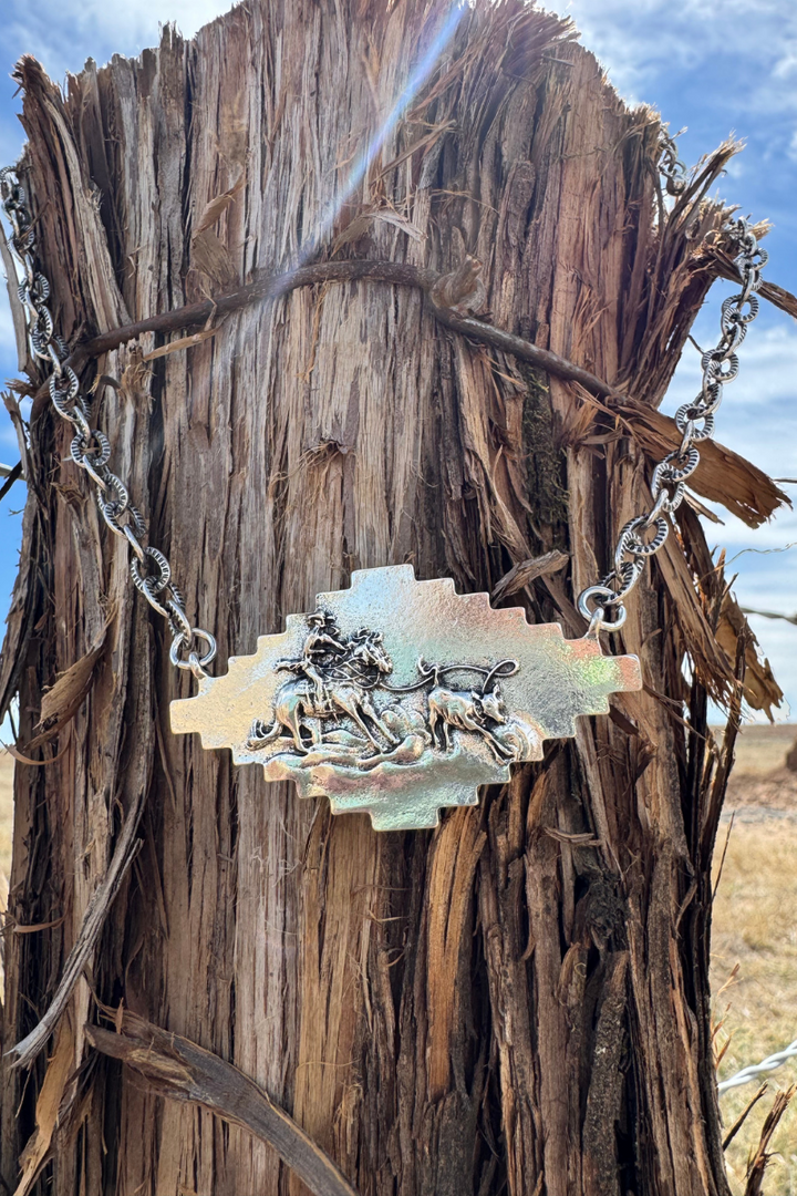 Lasso in some charm with our Calf Roper Necklace! This cute accessory features an aztec-inspired calf roper, adding an adorable touch to any outfit. Perfect for the cowgirl at heart (or the cowgirl wannabe)! Yee-haw!