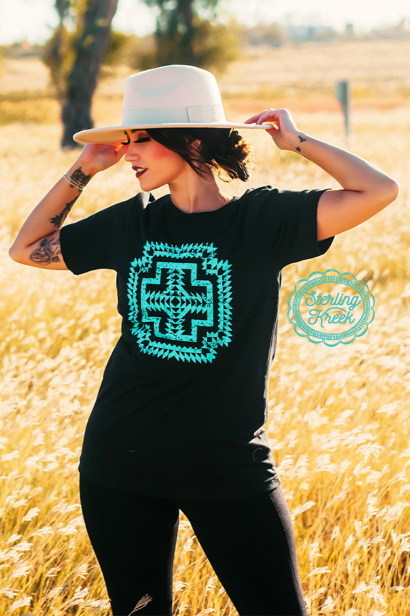 Who doesn't love a good Aztec tee? The black base of this shirt really makes the turquoise print POP! We hope you enjoy this shirt as much as we do!   Mariah is wearing a Small