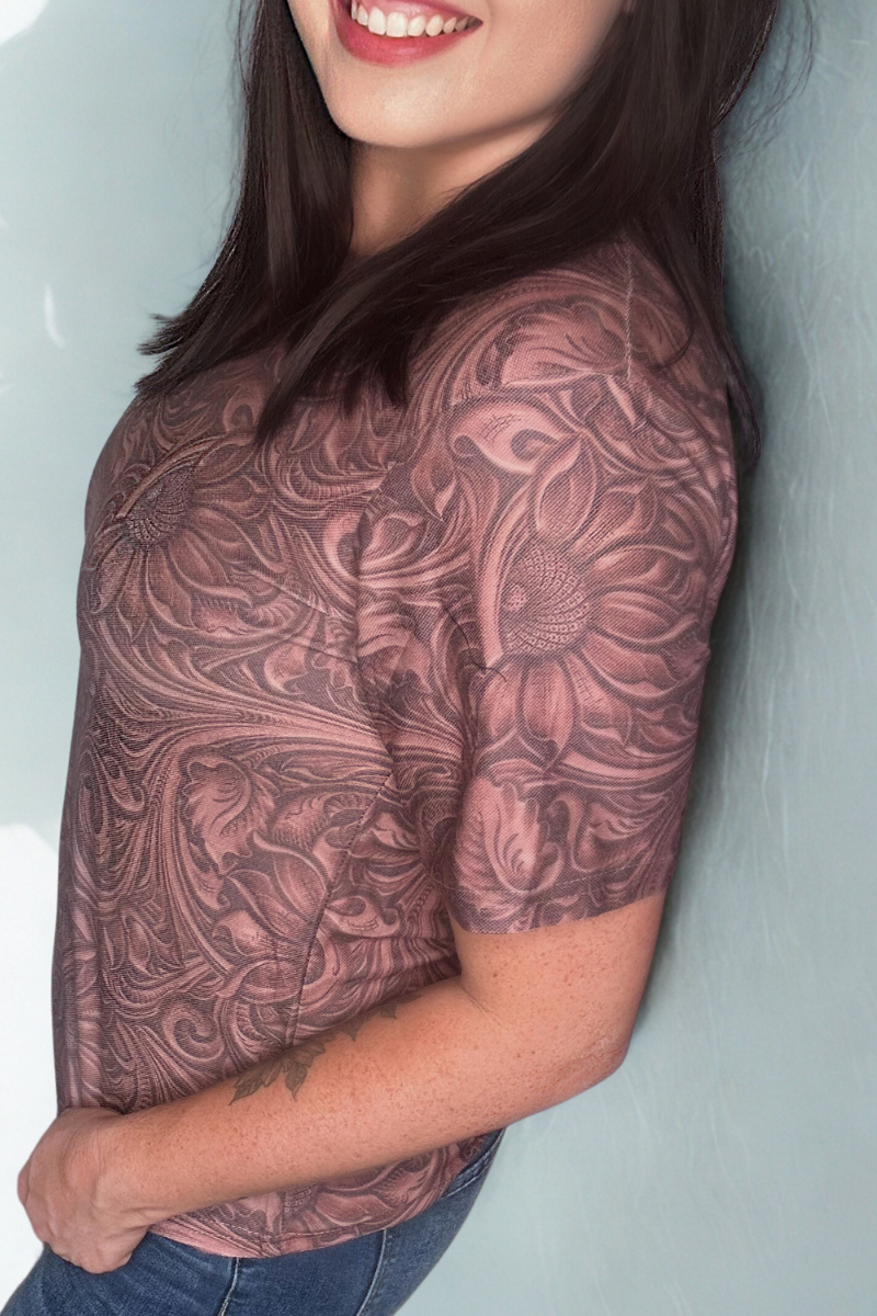 Saddle up for comfort with our Country Roads Crew Neck Tee! This playful top features an adorable tooled pattern that adds a touch of western charm to your wardrobe. Snuggly soft fabric keeps you comfy all day long, whether you're hitting the trail or just lounging around the ranch. Your new favorite go-to tee for fun, casual style!