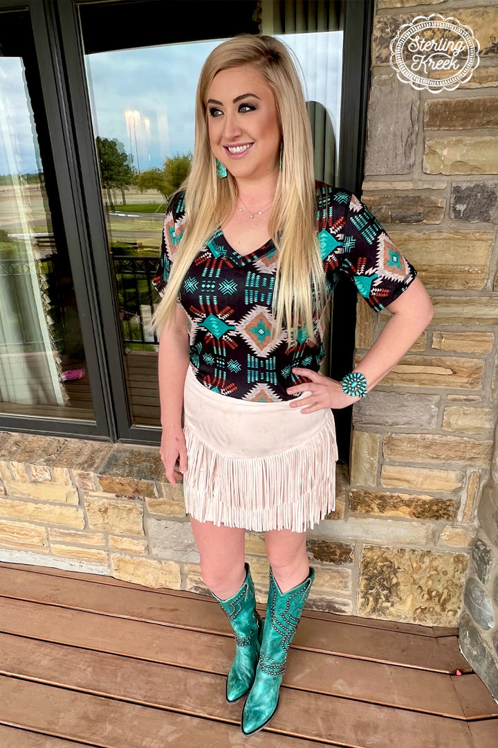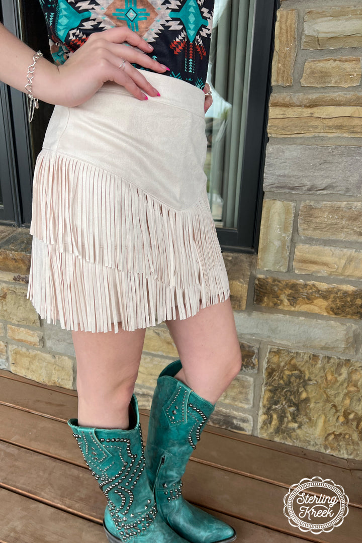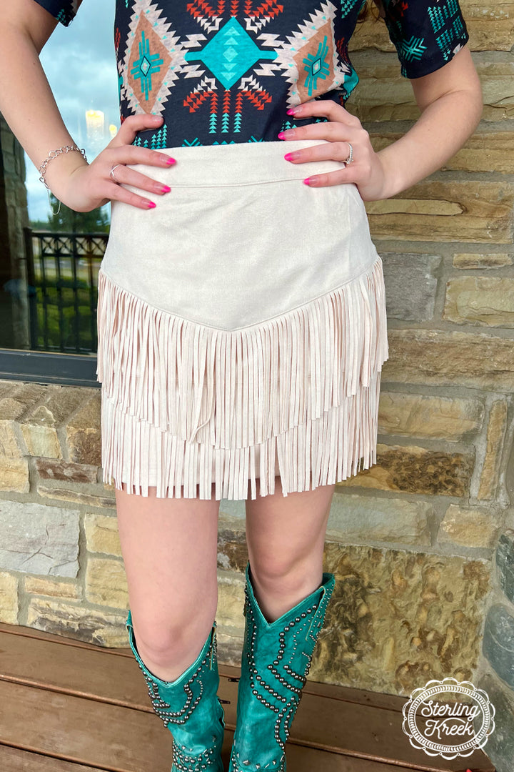 Be ready to hit the dancefloor (or, like, the grocery store) in this Fort Worth Fringe Skirt! This sassy little number is made of tan fringe that swirls and twirls every time you move. Don't be shy — unleash your inner wild thing!