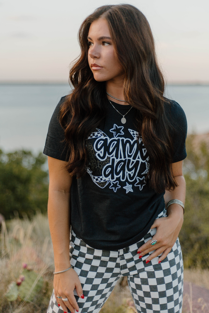 Get ready to cheer in style with this playful black tee featuring "Game Day" text, a bold leopard-print football, and stars. Perfect for showing your team spirit with a fun, fashionable twist. Comfortable and eye-catching, it’s your new go-to for every game day celebration.