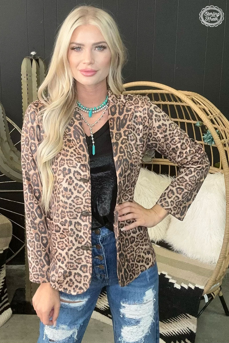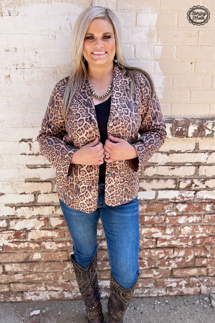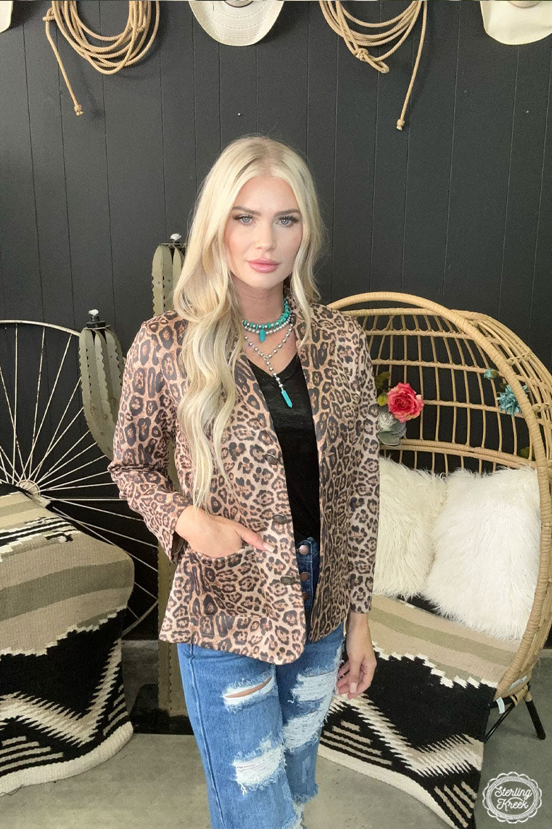 This sophisticated-meets-sassy Loveland Kitty Blazer offers all the chic style you need with an extra dose of wild! Making a statement with its cheetah print, it also features two pockets plus a style upgrade with buffalo nickel buttons. Meow!