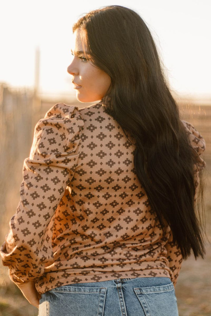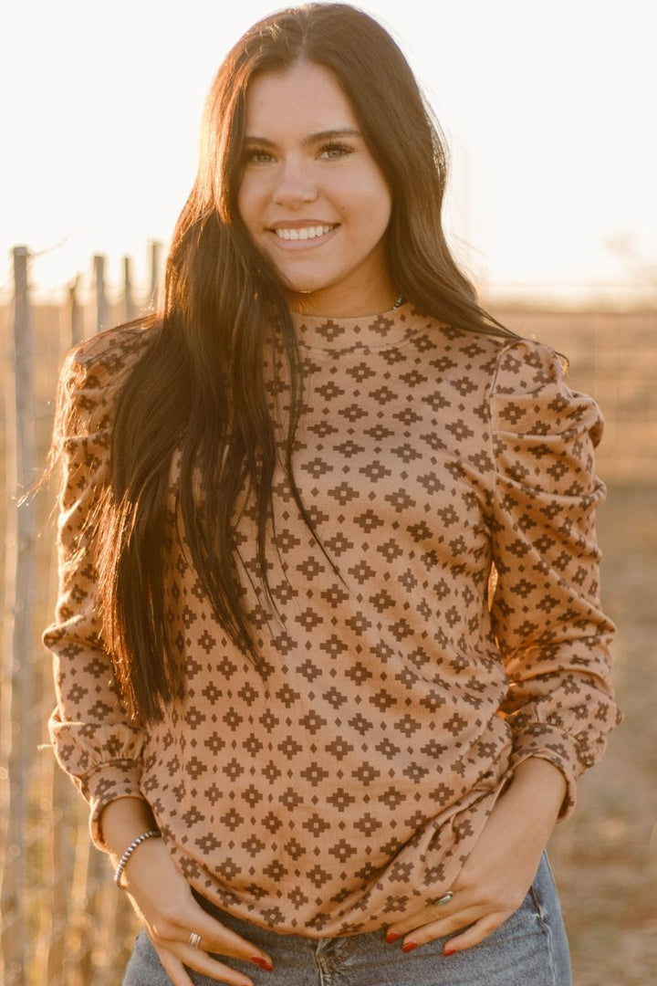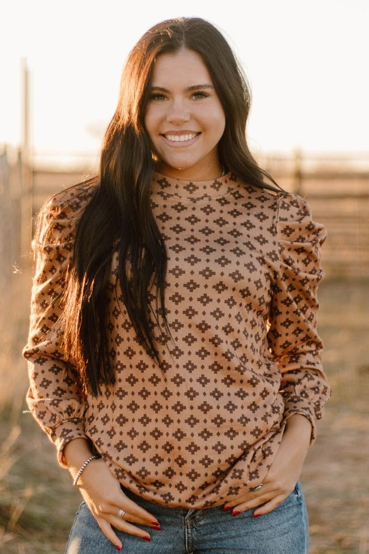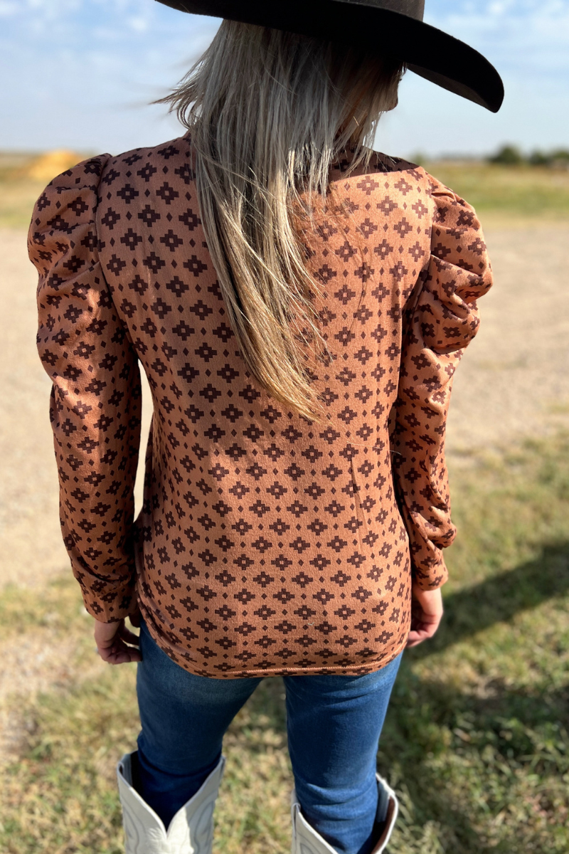 The Made For You Top is a unique saddle-colored top with playful bubble sleeves and a trendy high collar. The brown aztec design adds a touch of quirkiness to this versatile top. Perfect for those who want to stand out and make a statement with their style.