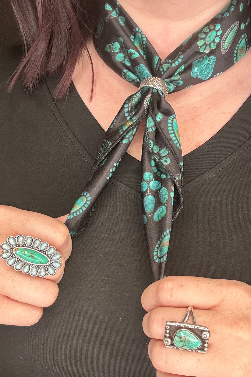 Add a little flair with this mini concho kreek wildrag, perfect for adding a touch of fun to any outfit. With a black wildrag base and conchos for an added dimension, you'll be oozing unique style in no time. Such a small piece, such a BIG statement!