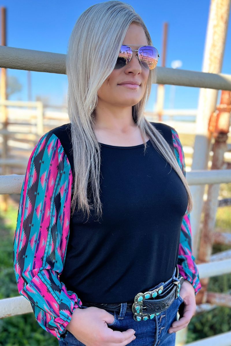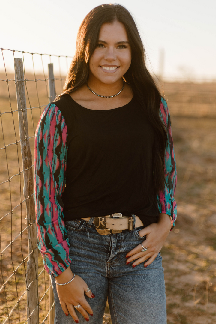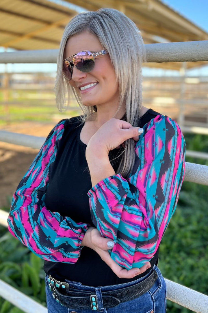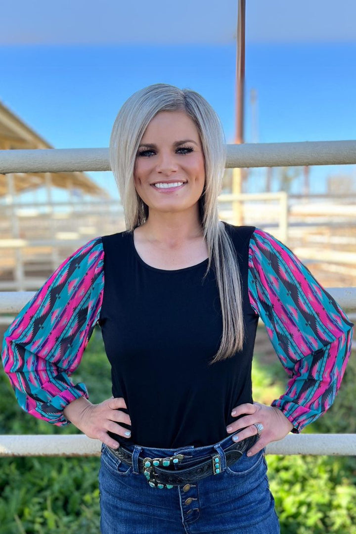 This top is so fun! This is another bubble sleeve with the perfect color combo! The pink, and turquoise pop off the black base! This shirt has the prettiest sheer sleeves and little flare cuffs for a little extra pizzazz! This shirt is so flattering and comfortable! It runs true to size!