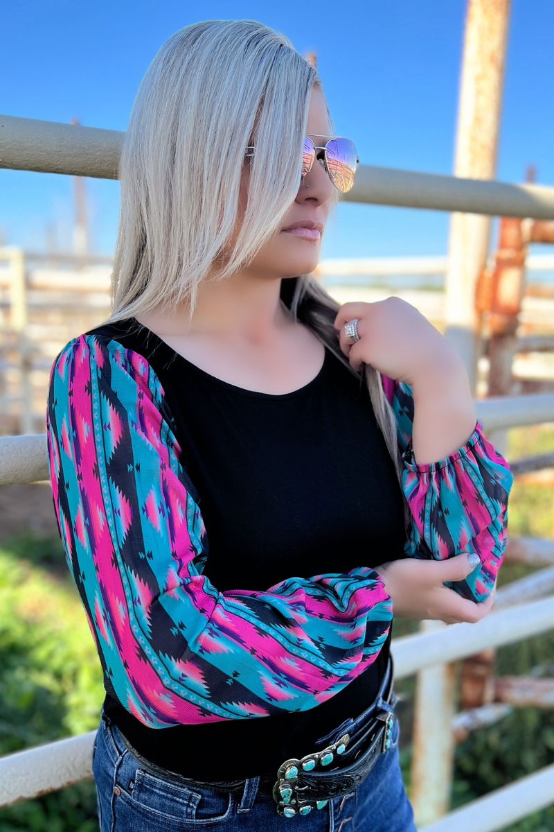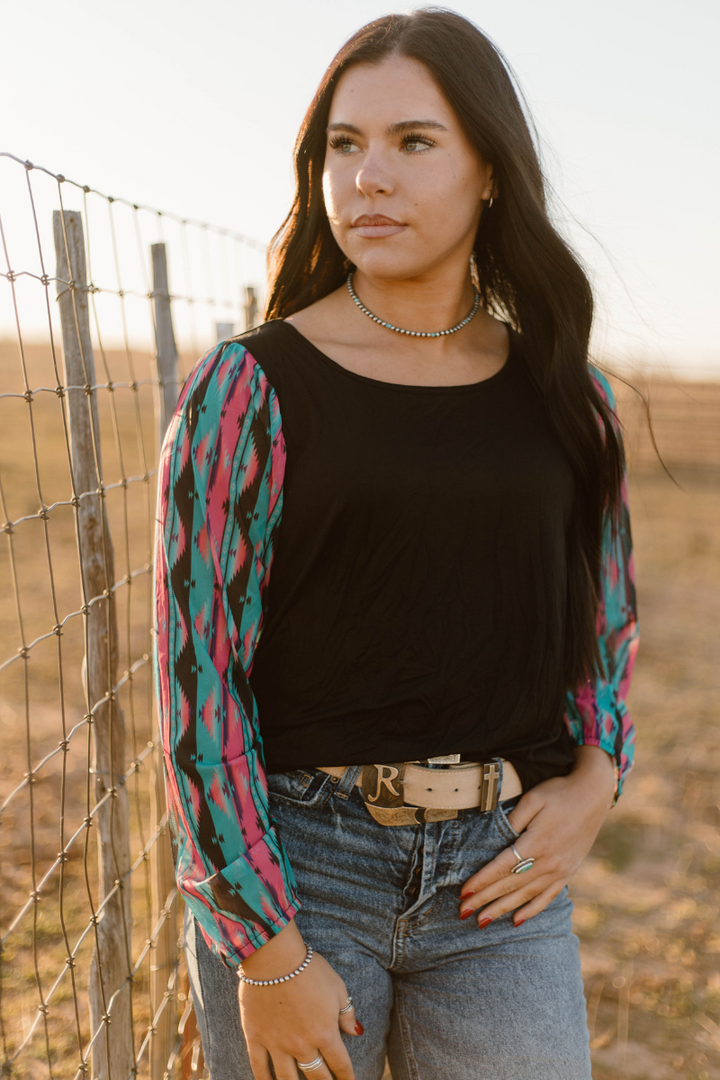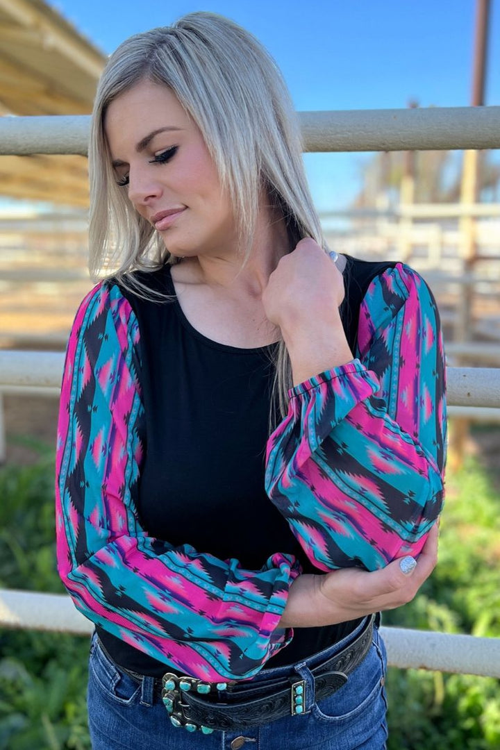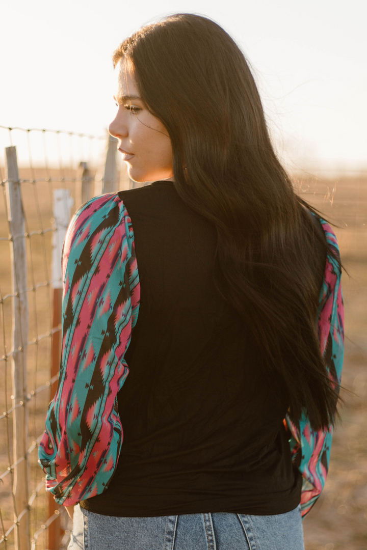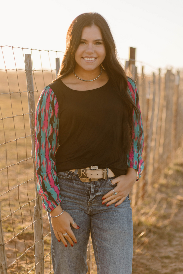 This top is so fun! This is another bubble sleeve with the perfect color combo! The pink, and turquoise pop off the black base! This shirt has the prettiest sheer sleeves and little flare cuffs for a little extra pizzazz! This shirt is so flattering and comfortable! It runs true to size!