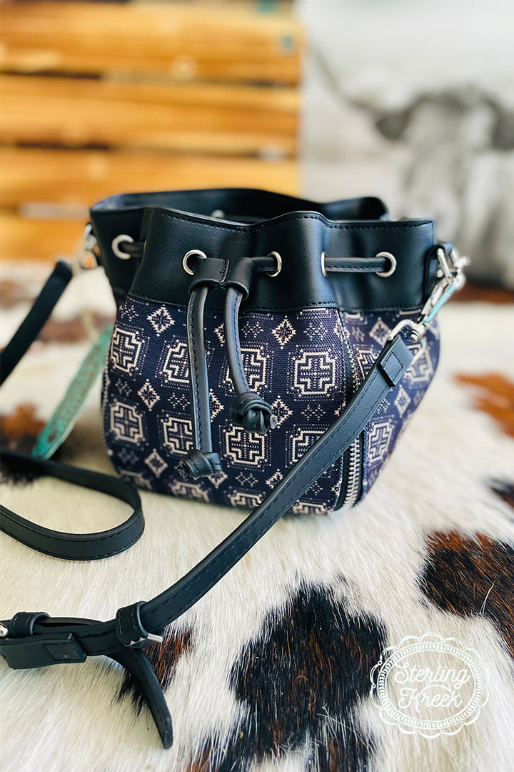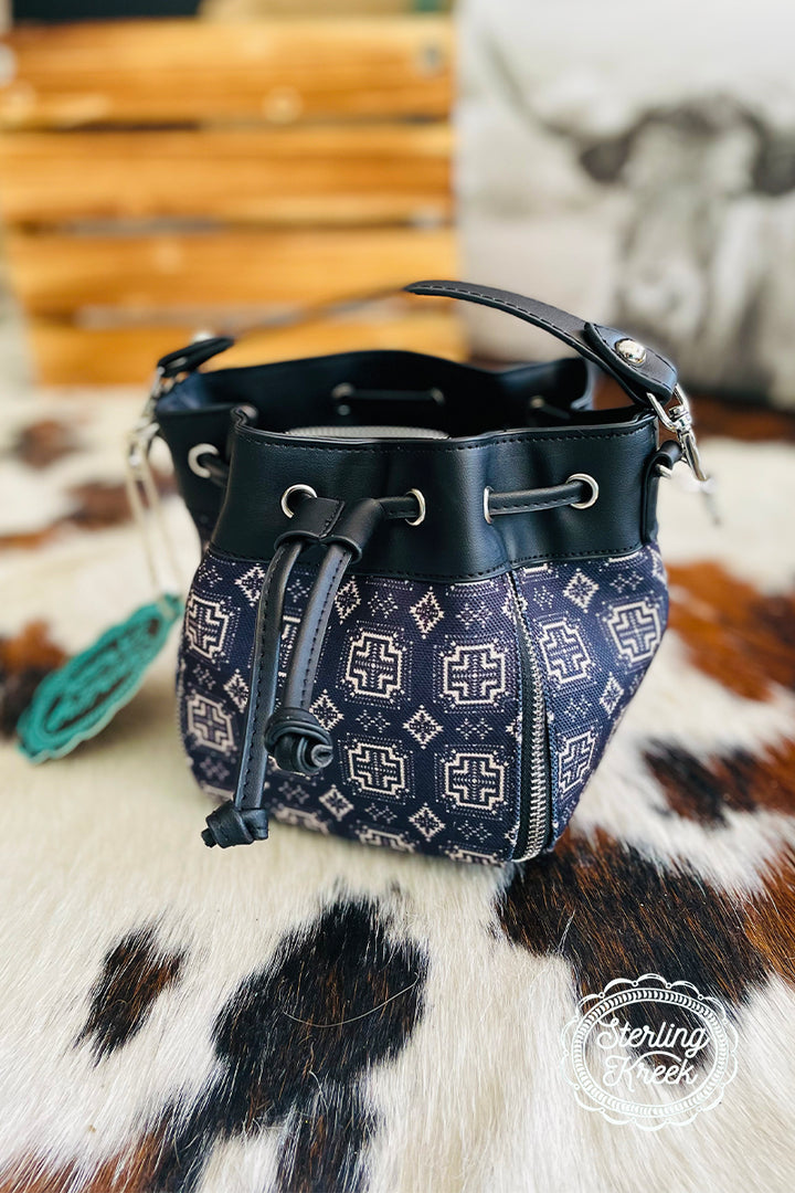 This purse is small but mighty! This is a "bucket" style bag, with a black and white aztec pattern! This bag had an interior zipper pocket for your lose change or receipts. This purse also had an open interior pocket as well. This bag offers a hand strap, or a crossbody strap!