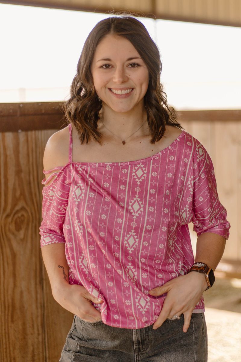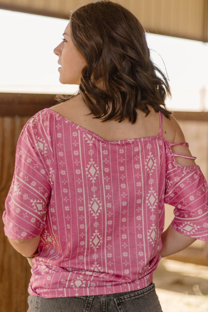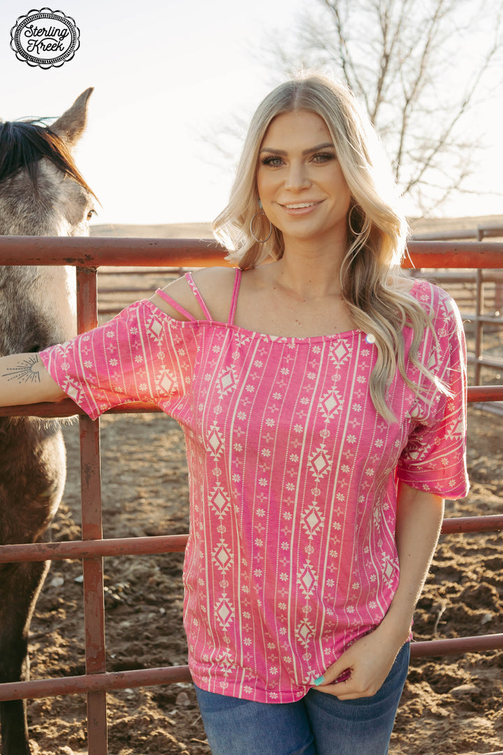 Turn heads in this pink and white off the shoulder top! With a unique aztec print and three stylish straps, this top is a twist of fate you won't want to miss. Perfect for showing off your style with a playful and comfy twist!