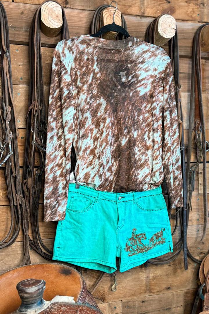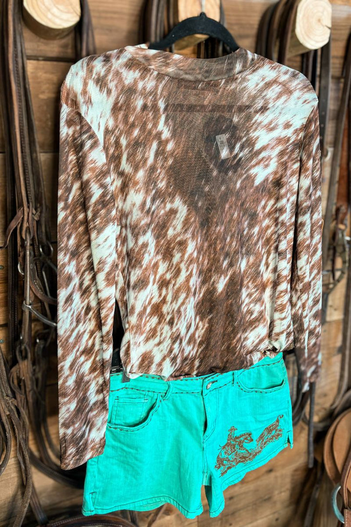 Embrace your inner cowgirl with the Up In Texas Top. This long sleeve mesh top features a unique cow hide print that's sure to turn heads. Lightweight and breathable, it's perfect for a day out in the sun (or at the rodeo). Yeehaw!
